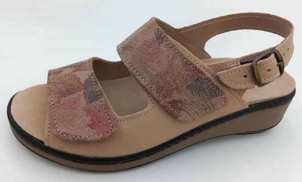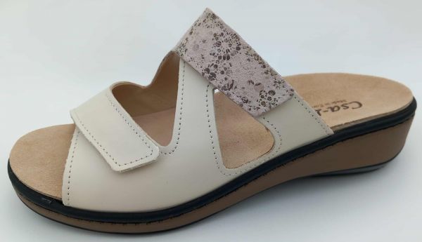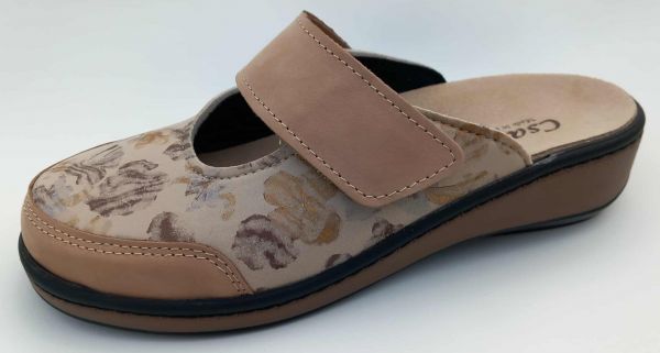 Szín: virág-drapp, színkód: 403-102 /méretek:35-42/ könnyű kényelmes papucs, valódi bőr felsőrész, tépőzárral állítható pánt. A talpbetét puha rugalmas anyagból készült,valódi bőrrel bevont, kivehető, igény esetén egyedi talpbetétre cserélhető. Ideális sarokmagasság, rugalmas, csúszásmentes talp.