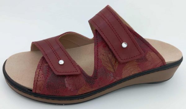 bordó, színkód: 27 / méretek: 35-42/ könnyű kényelmes papucs, valódi bőr felsőrész, tépőzárral állítható pánt. A talpbetét puha rugalmas anyagból készült,valódi bőrrel bevont, kivehető, igény esetén egyedi talpbetétre cserélhető. Ideális sarokmagasság, csúszásgátlóval ellátott talp.