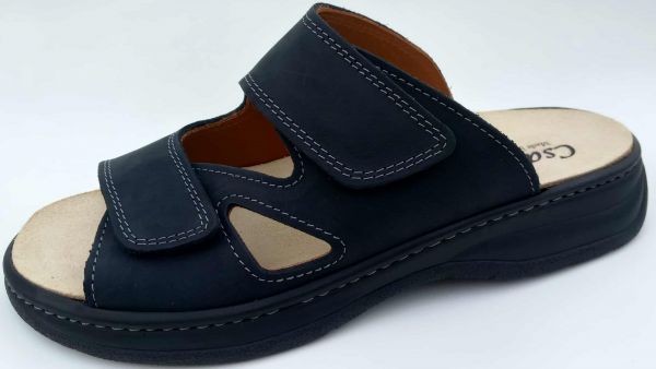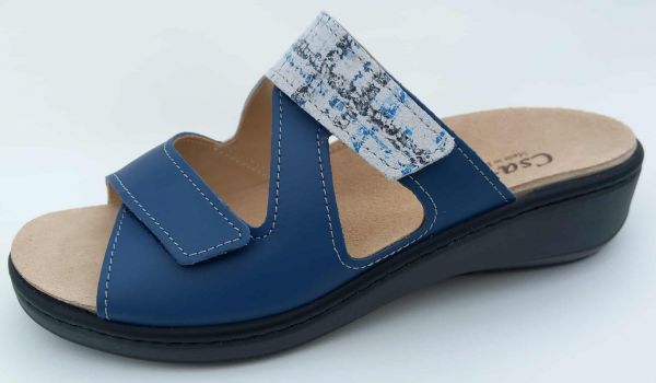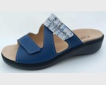 kék, kényelmi papucs mindennapos használatra, színkód: 66-110 /méretek: 35-42/, könnyű kényelmes papucs, valódi bőr felsőrész, tépőzárral állítható pánt. A talpbetét puha rugalmas anyagból készült,valódi bőrrel bevont, kivehető, igény esetén egyedi talpbetétre cserélhető. Ideális sarokmagasság, rugalmas, csúszásmentes talp.