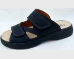 fekete, színkód:101 /méretek:39-46/ könnyű kényelmes papucs, valódi bőr felsőrész, tépőzárral állítható pánt. A talpbetét puha rugalmas anyagból készült,valódi bőrrel bevont, kivehető, igény esetén egyedi talpbetétre cserélhető. Rugalmas talp.